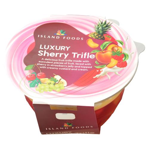 A delicious fruit trifle made with succulent pieces of fruit. laced with sherry in strawberry jelly and topped with creamy custard and cream.