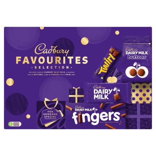 Includes a bar of Cadbury Dairy Milk, a sharing bag of Buttons, a box of Fingers and a Twirl bar