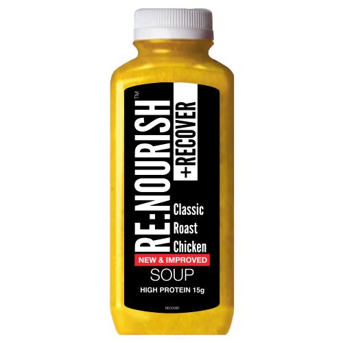 RENOURISH +Recover Classic Roast Chicken Soup delivers the comforting taste of a traditional roast dinner in a bottle. Made with succulent chicken, peas, leeks, broccoli, and savoy cabbage, infused with Herbes de Provence and nourishing chicken bone stock. Packed with 15g of protein, it’s the perfect way to refuel and recover.