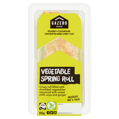 Vegetables (49%) (Carrot, Cabbage, Red Pepper, Spring Onion, Beansprout, Water Chestnut), Pastry (Wheat Flour, Water, Rapeseed Oil, Salt), Rapeseed Oil, Sweet Chilli Sauce (Water, Sugar, Barley Malt Vinegar, Lemon Juice, Red Pepper, Red Chilli Puree, Cornflour, Garlic Puree, Salt, Garlic Granules, Colour: Paprika Extract, Chilli Flakes), Potato Starch, Ginger Puree, Soya Sauce (Water, Soya Bean, Wheat, Salt), Brown Sugar, Salt, Chinese Five Spices (Star Anise, Cinnamon, Ginger, Fennel, Clove, Coriander, Dill Seed), Fortified Wheat (Wheat Flour, Calcium Carbonate, Niacin, Iron, Thiamine), White Pepper,