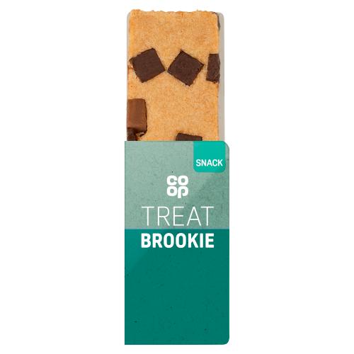 Moist chocolate brownie topped with a layer of cookie and sprinkled with milk and dark chocolate chunks.