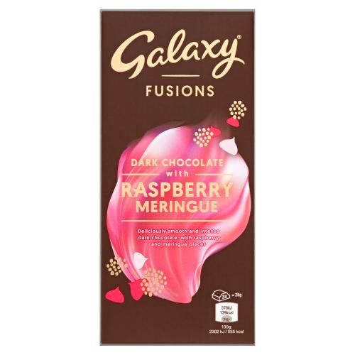Deliciously smooth and intense dark chocolate, expertly blended with raspberry and meringue pieces. Explore the rest of our Galaxy® Fusions range for more deliciously unexpected combinations to treat the senses.