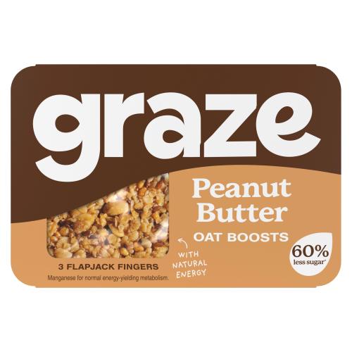 Treat your tastebuds to the graze Peanut Butter Oat Boosts: the perfect pick-me-up you won't be able to put down, Wholegrain oat flapjack with roasted peanuts and peanut butter for a deliciously moreish taste, Sweetened with chicory root fibre, these graze flapjack bars contain a whopping 60% less sugar than the average cereal bar*, These protein-powered snacks are the perfect mid-morning pick-me-up alongside a cuppa, giving you an oat-fuelled boost until lunch., These mouthwatering oat bars are high in fibre, contain nothing artificial and are suitable for vegans, Graze satisfies all your snack cravings: Enjoy Graze Crunch, a savoury treat packed with veg and mixed nuts, our sweet oat flapjack range, and on-the-go options. Perfect for lunchbox snacks and more!