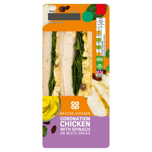 White Bread (48%) (Wheat Flour (Wheat Flour, Calcium carbonate, Iron, Niacin, Man), Water, Yeast, Salt, Emulsifiers (Mono- and diglycerides of fatty acids, Mono- and diacetyl tartaric acid esters of mono- and diglycerides of fatty acids), Wheat Protein, Rapeseed Oil, Flour Treatment Agent (Ascorbic acid), Wheat Flour, Wheat Starch), Cooked Chicken Breast (Chicken Breast, Salt, Chicken Stock (Water, Chicken Extract), Cornflour), Spiced Mayonnaise (8%) (Rapeseed Oil, Water, Spice Paste (Water, Seasoning (Spices (Turmeric, Cayenne Pepper, Clove, Coriander, Cumin, Fennel, Fenugreek, Ginger, Mustard Powder), Onion Powder, Rusk (Wheat Flour (Wheat Flour, Calcium Carbonate, Iron, Niacin, Thiamin), Salt), Salt, Rapeseed Oil, Tomato Powder, Colour (Plain Caramel), Turmeric Extract, Garlic Powder, Leek Extract), Spirit Vinegar, Apricot Purée, Concentrated Apricot Juice, Concentrated Lemon Juice, Ground Coriander, Ground Cumin, Ground Fenugreek, Garam Masala (Coriander, Cinnamon, Cumin, Black Pepper, Ginger, Cloves), Salt, Ground Cardamom), Pasteurised Egg, Sugar, Pasteurised Egg Yolk, Cornflour, Salt), Spinach (6%), Spiced Mayonnaise (5%) (Water, Marinade (Water, Sultanas (Sultanas, Sunflower Oil), Seasoning (Onion Powder, Turmeric, Rusk (Wheat Flour (Wheat Flour, Calcium carbonate, Iron, Niacin, Thiamin), Salt), Salt, Tomato Powder, Fenugreek, Cumin, Colour (Plain Caramel), Turmeric Extract, Coriander, Clove, Ginger, Cayenne Pepper, Leek Extract, Fennel, Garlic Powder, Rapeseed Oil, Mustard Powder), Sugar, Red Wine, Concentrated Lemon Juice, Onion Purée, Tomato Paste, Ground Cumin, Ground Coriander, Garam Masala (Coriander, Cinnamon, Cumin, Ginger, Black Pepper, Clove), Salt, Ground Cardamom, Ground Fenugreek), Rapeseed Oil, Cornflour, Spirit Vinegar, Citrus Fibre, Salt, Sugar, Pasteurised Egg Yolk), Sultanas (3%) (Sultanas, Sunflower Oil), Apricot and Mango Chutney (3%) (Sugar, Mango Purée, Apricot Pulp, Malt Vinegar (Barley), Apple, Dried Apricot, Dried Onion, Mango, Ginger Purée, Salt, Coriander, Coriander Leaf, Ground Coriander, Garlic Powder, Ground Ginger), Onion, Coriander Leaf, 25% Chicken,