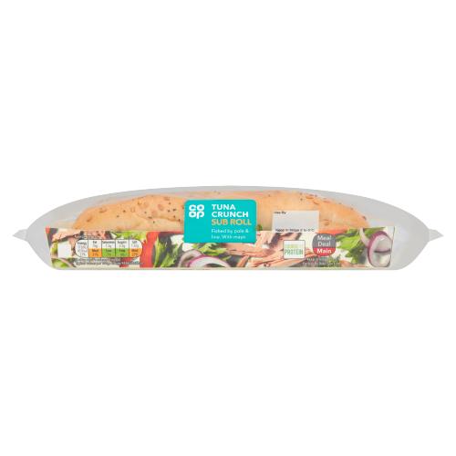Seed Topped White Roll (52%) (Wheat Flour (Wheat Flour, Calcium Carbonate, Iron, Niacin, Thiamin), Water, Golden Linseed, Millet Seeds, Yeast, Rapeseed Oil, Poppy Seeds, Salt, Sugar, Broad Bean Flour, Wheat Flour, Wheat Protein, Flour Treatment Agent (Ascorbic Acid)), Tuna (21%) (Skipjack Tuna (Fish), Water, Sea Salt), Mayonnaise (14%) (Rapeseed Oil, Water, Pasteurised Whole Egg, Sugar, Stabilisers (Guar Gum, Xanthan Gum), Acidity Regulator (Acetic Acid)), Salt, Mustard Flour, Lettuce (5%), Red Onion (4%), Red Pepper (3%), 19% Tuna,