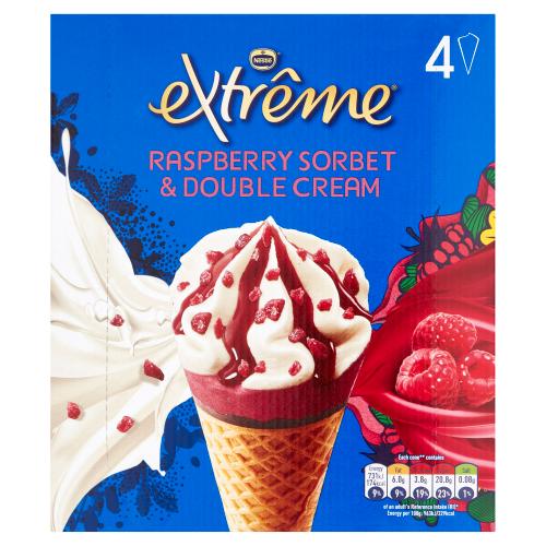 Double cream ice cream, Fruity raspberry pieces, Fruity raspberry sorbet, Crunchy wafer, Raspberry sauce, Double cream ice cream, Extreme® chocolatey tip