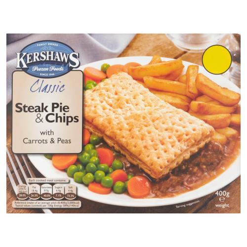 Tender steak in a delicious rich gravy with chips, carrots, peas and a light, flaky pastry top.