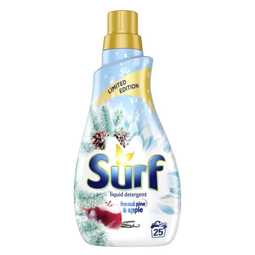 Surf Frosted Pine & Apple Liquid Washing Detergent features a long-lasting fragrance of fresh, frosted pine and crisp apple notes to whisk you away to a winter wonderland. The fresh red apple scent combined with the irresistible green pine fragrance will bring back memories of festive family moments and conjure up images of sparkly Christmas lights. Let Surf's laundry range bring you the joy of fragrance, long after you've washed your clothes. With burst after burst of uplifting fragrance released throughout your day, your laundry will stay fragrantly fresh, with a brilliant deep clean you will love. This powerful laundry liquid, with its winter fragrance, is suitable for washing both colours and whites. It is also suitable for cold washes and can be used for pre-treating. It delivers excellent fragrance and brilliant cleaning. All this at an affordable price. Our bottle is 100% recyclable with the sleeve removed. To use Surf liquid effectively, pour into the dosing ball and then place this in the drum of your washing machine. Then add your laundry and start the wash. For best results, use 35 ml Surf liquid for standard loads (4-5 kg) and soft/medium water. Use 52 ml for larger or dirtier loads and hard water. Choose Surf—UK’s No.1 fragrance detergent brand.