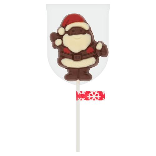 Milk chocolate lollipop with white chocolate and red coloured decoration.