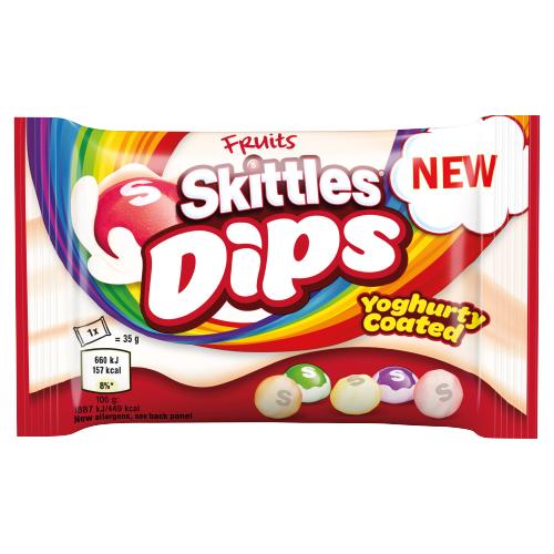 Skittles Dips are an indulgent, multi-textured unique fruity experience combining the harder chewy Skittles people love with a soft, creamy yoghurt coating
