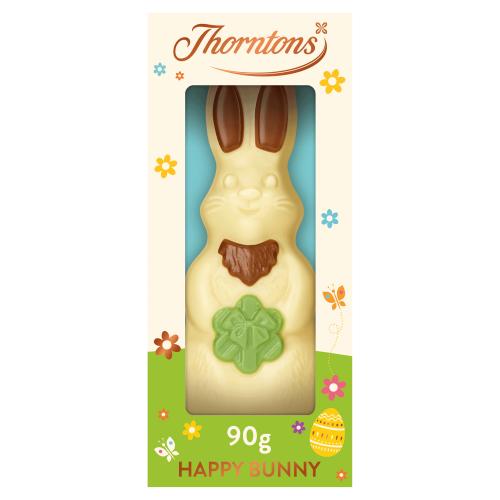 Thorntons White Chocolate Easter Bunny, a delicious hollow white chocolate bunny model with white and green decoration. The perfect gift to give someone special this Easter