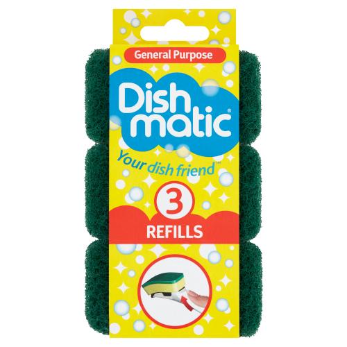 Available Refills Yellow/White/Blue - Non Scratch Green - General Purpose Black - Extra Heavy Duty Available refills fits all Dishmatic handles.
