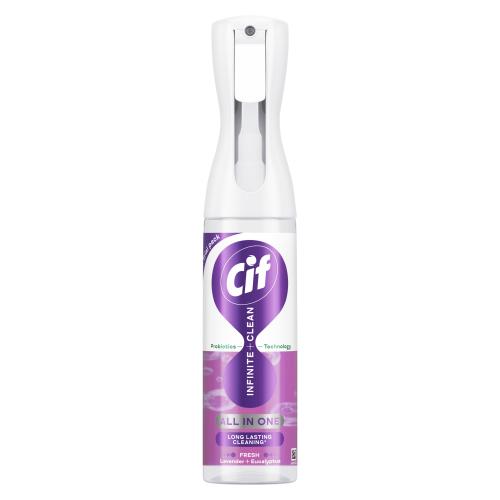 One Spray Cleans it All^: Cif Infinite Clean Lavender & Eucalyptus All in One Cleaner works throughout your home and beyond, cleaning hard surfaces and refreshing soft furnishings, Experience Unmatched Versatility: From greasy kitchen hobs and dirty tiles to dusty bookshelves and smudgy glass tables, this multi surface cleaner handles it all, Lavender & Eucalyptus Fragrance: Our cleaning spray leaves the house smelling clean and fresh with its invigorating continuous mist, making your home not just clean but also fragrant, Suitable for all: This cleaner spray is suitable for areas around kids*** and pets**, Long-Lasting Clean*: This cleaner spray is powered by probiotic technology that continues to clean for up to 3 days, even after you stop, Cif Infinite Clean comes with a reusable spray device - just add your cleaner spray device onto a new reload pack and spray away