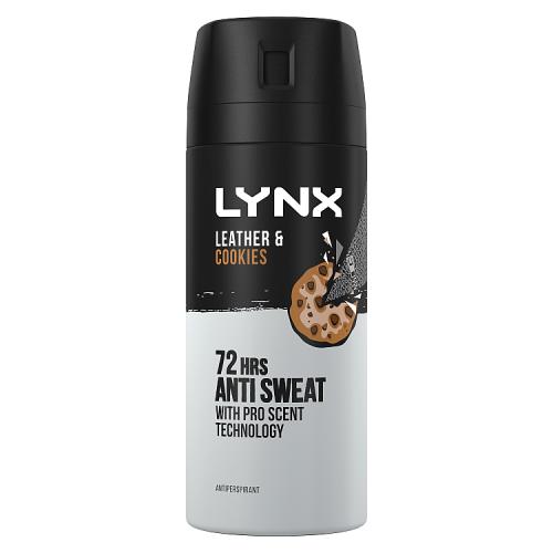 LYNX Leather & Cookies Anti-Perspirant Aerosol Deodorant protects you from sweat and odour for up to 72 hours and leaves you with a masculine fragrance combo of leather & cookies, Feel dry and confident with the Pro Scent Technology featured in this anti-perspirant deodorant aerosol, With an anti-sweat formula, this men's deodorant spray protects against odour and wetness, keeping you dry and protected for longer, This LYNX deodorant spray for men has a unique formula that will leave you feeling fresh and smelling great all day long, With its bold fragrance, this LYNX deodorant is perfect for those who want to make a statement, Great-smelling LYNX deodorant spray in an infinitely recyclable can - fresher you, cleaner planet