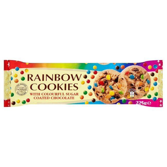 Cookies with 21% sugar coated chocolate and 14% dark chocolate.
